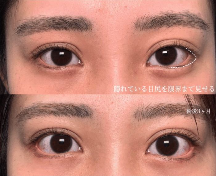 - 皮膚切開:目尻の皮膚を切開し、下まぶたのラインを下げる方法。
