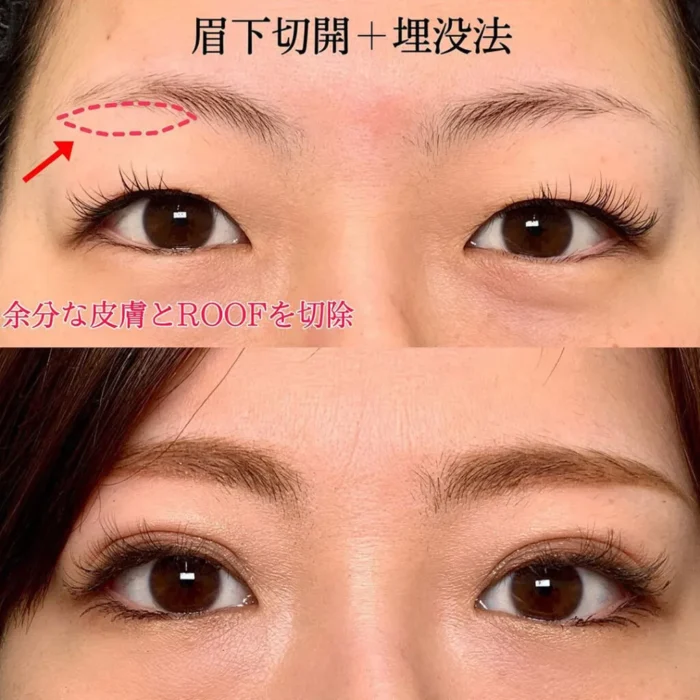 また、眉下のラインに沿って切開するため、傷跡が目立ちにくく、自然な仕上がりが期待できるという大きなメリットもあります。