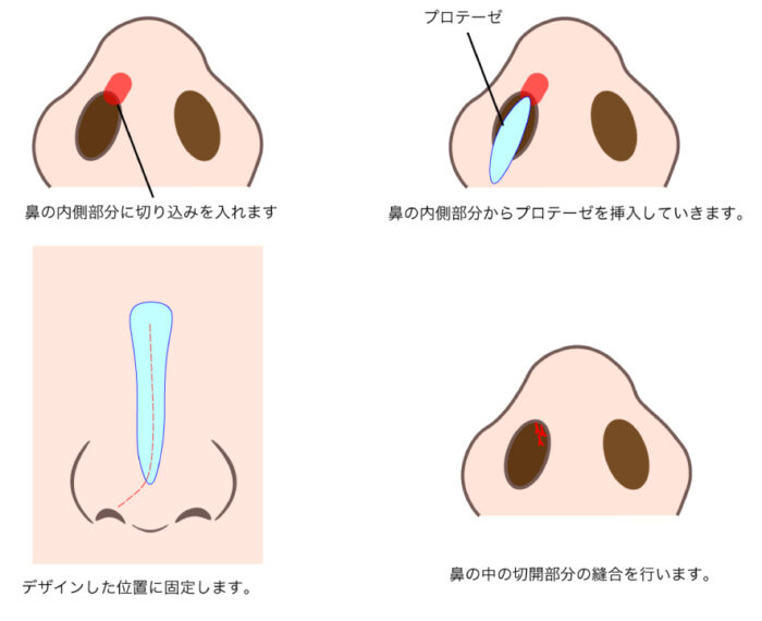 お客様の鼻の形に合わせて選択・加工したプロテーゼを挿入します。